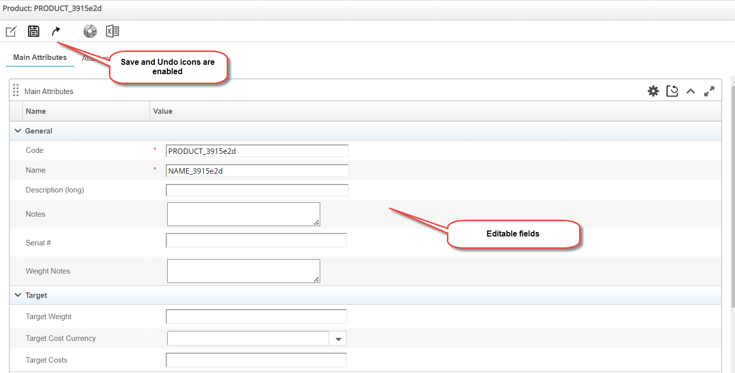 icon to discard modifications.The data entered in the Main Attributes dashlet is committed to the database. The fields on the page are no longer editable.