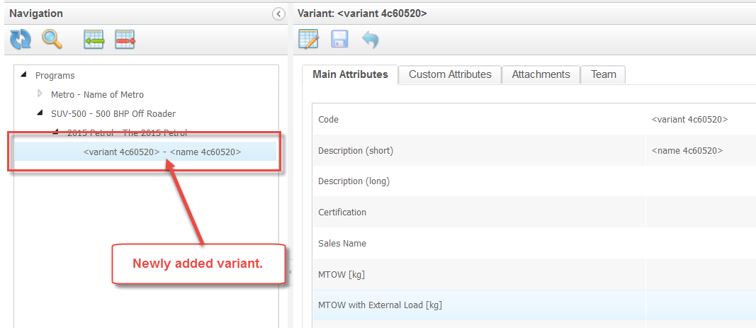 A Version can have a number of child Variants in the Program hierarchy. The information associated with a Variant can be Main Attributes, Custom Attributes, File Attachments, and User Access Permissions.