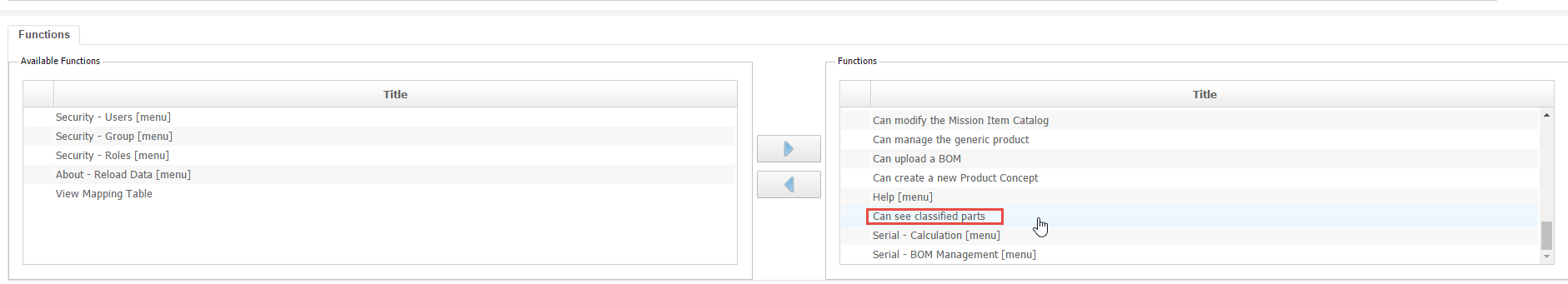 User roles enabled with classified function access can only view the classified parts in the catalogue.