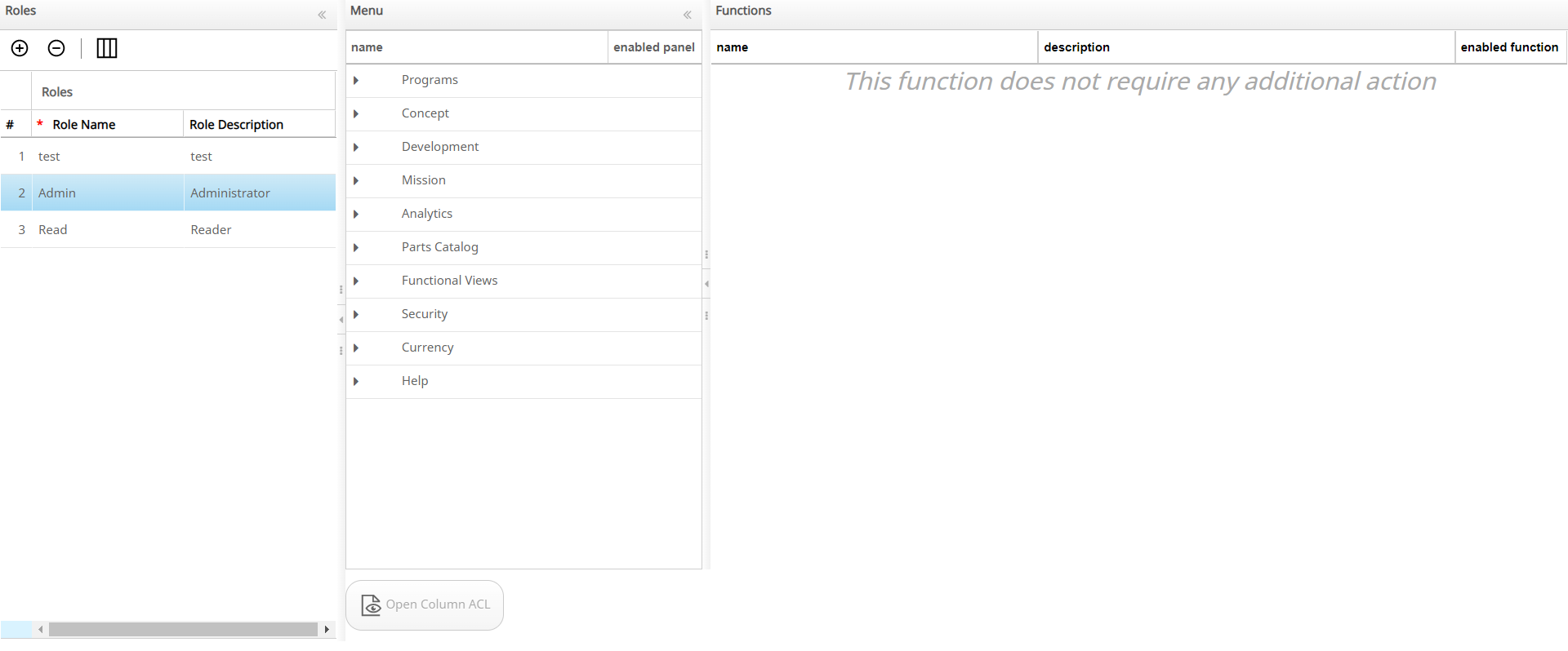 The Roles section allows authorized users to visualize and manage the functions of a role in the system, and create and edit the role functionality data.