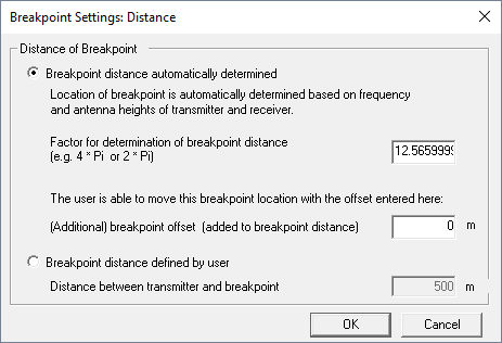 The breakpoint distance depends on the height of transmitter and receiver as well as the wavelength. The initial value is calculated according to . This value can be modified by setting an additional offset (in meters).