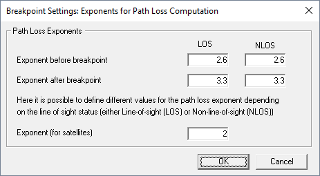 Exponent before breakpoint (LOS/NLOS) / Exponent after breakpoint (LOS/NLOS). These four exponents influence the calculation of the distance dependent attenuation. For further refined modeling approaches different exponents for LOS and NLOS conditions can be applied. The default values are 2.4 and 2.8 for the exponents before the breakpoint (LOS and NLOS) and 3.6 and 4.0 for the exponents after the breakpoint (LOS and NLOS).