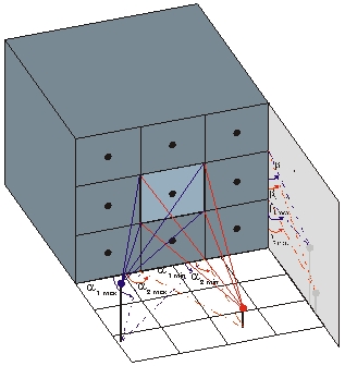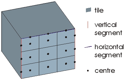 Only for the base station with an arbitrary position and antenna pattern (not fixed at the pre-processing), the visible elements including the incident angles have to be determined at the prediction. Then, starting from the transmitter point, all visible tiles and segments are tracked in the created tree structure considering the angle conditions. This tracking is done until a prediction point is reached or a maximum number of interactions (reflections / diffractions / transmissions (only indoor) ) is exceeded. The following picture shows the division into tiles and segments.