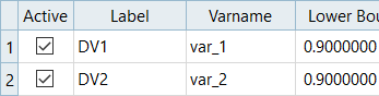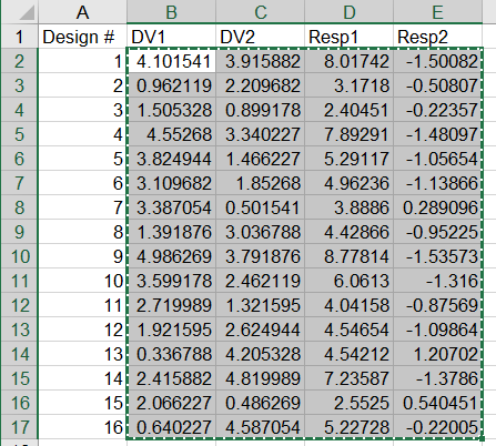 The spreadsheet used here contains five columns. The first column contains the numbering of the designs, the second and third columns contain the values of the two input variables for each design, and the fourth and the fifth columns contain the results of a DOE study previously run. Sixteen designs have been evaluated.