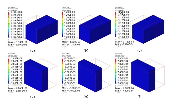 Figure 7. Built-in Macro Simulation in Multiscale Designer (Contour Plots). (a) and (d) x-direction stress in tension and compression, respectively; (b) and (e) x-direction strains in tension and compression, respectively; and (c) and (f) y-direction strains in tension and compression, respectively