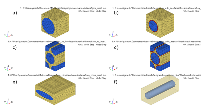 Figure 12. Fibrous Unit Cell Models. (a) square packing array; (b) square packing array with an interface; (c) hexagonal packing array; (d) hexagonal packing array with interface; (e) non-crimp ellipsoidal fabric; and (f) discontinuous fiber packing array
