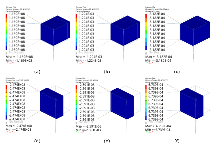 Figure 10. Structural Analysis in OptiStruct (Contour Plots). (a) and (d) x-direction stress in tension and compression, respectively; (b) and (e) x-direction strains in tension and compression, respectively; and (c) and (f) y-direction strains in tension and compression, respectively